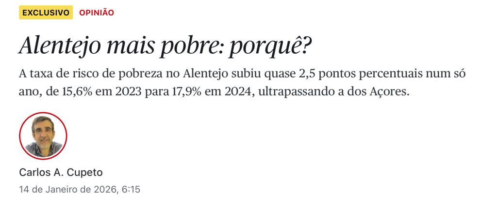 Alentejo mais pobre: porquê? Autor: Carlos A. Cupeto, Geólogo, professor na Universidade de Évora Artigo publicado no Público, em 14 de janeiro de 2026
