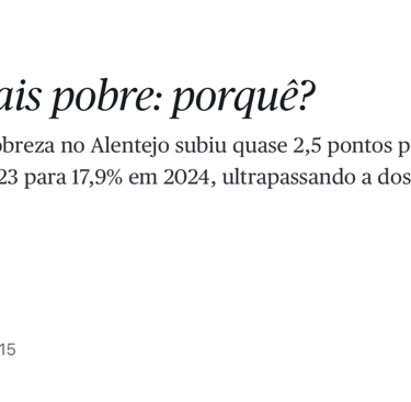 Os dados são claros e inquietantes. Segundo o estudo Portugal desigual, da Fundação Francisco Manuel dos Santos, atualizado com base no último Inquérito às Condições de Vida e Rendimentos do Instituto Nacional de Estatística (INE), divulgado a 11 de dezembro, o Alentejo passou a ser, em 2024, a região mais pobre do país. A taxa de risco de pobreza subiu quase 2,5 pontos percentuais num só ano, de 15,6% em 2023 para 17,9% em 2024, ultrapassando a dos Açores.