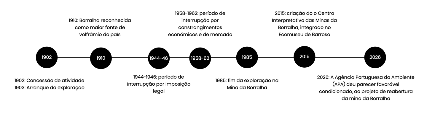 A exploração organizada arranca em 1903 e, poucos anos depois, em 1910, a Borralha já era reconhecida como a maior fonte de volfrâmio do país. Ao longo das décadas seguintes, a mina assumiu um papel central no fornecimento deste material, especialmente em períodos de maior procura internacional.